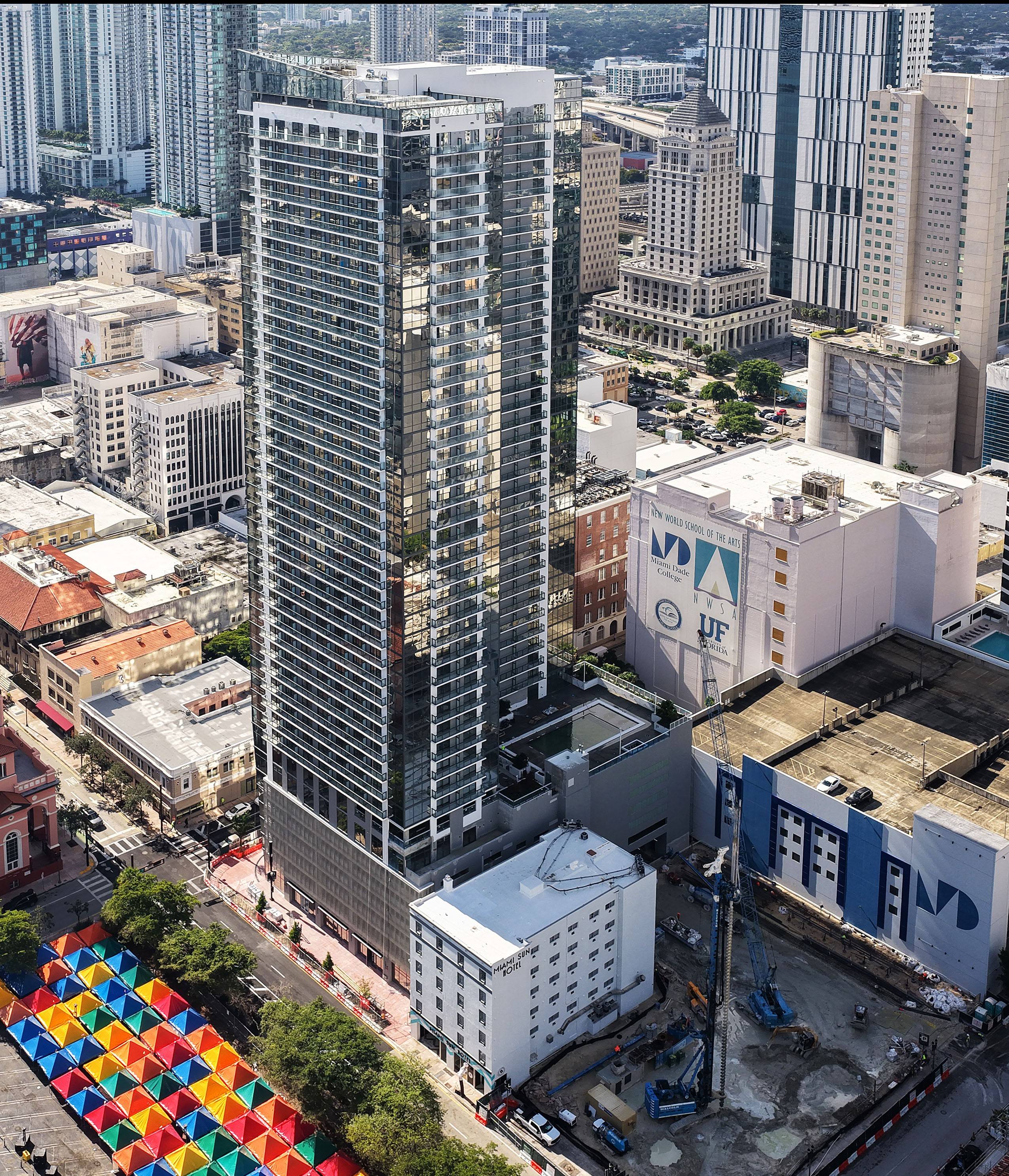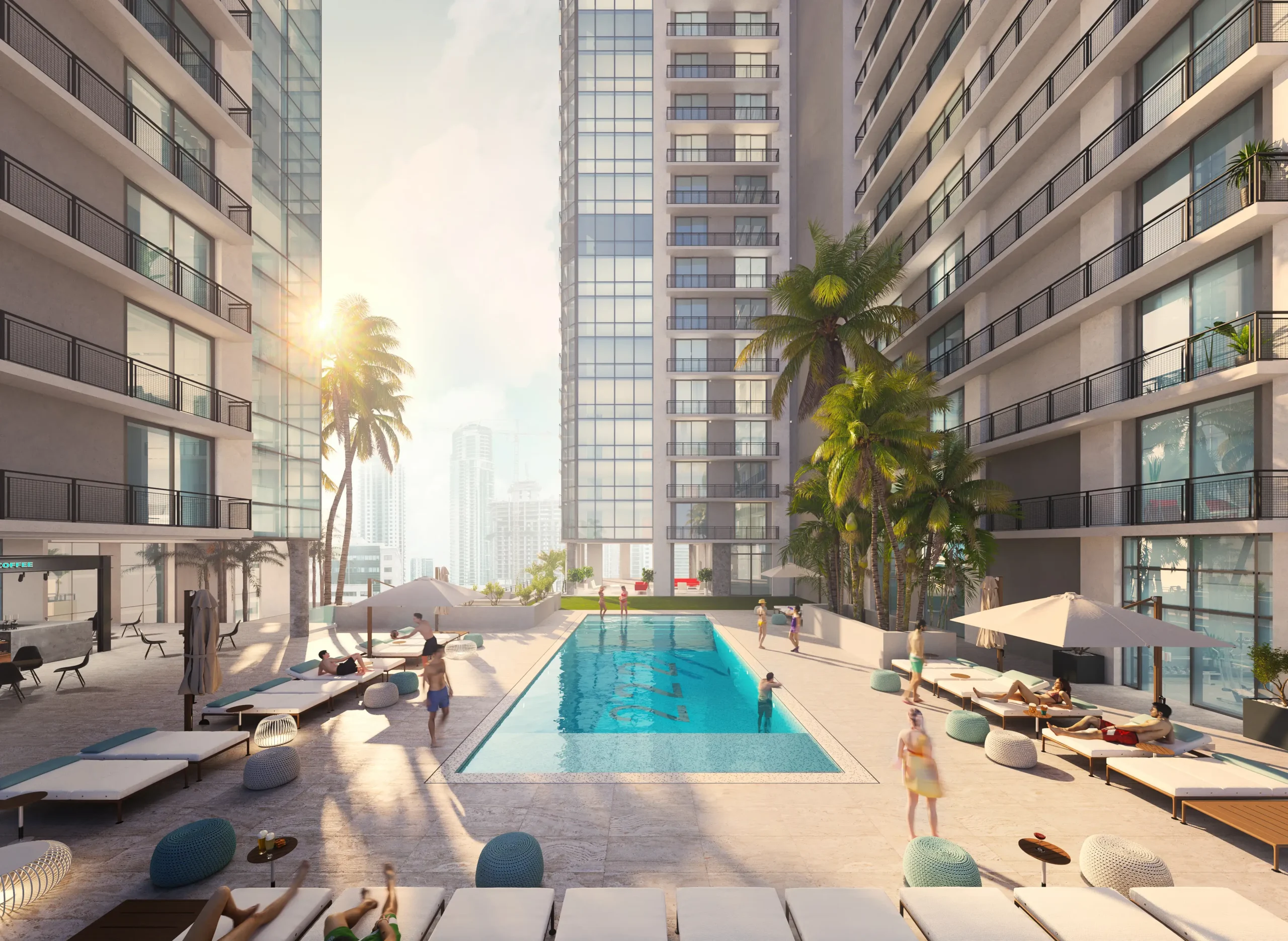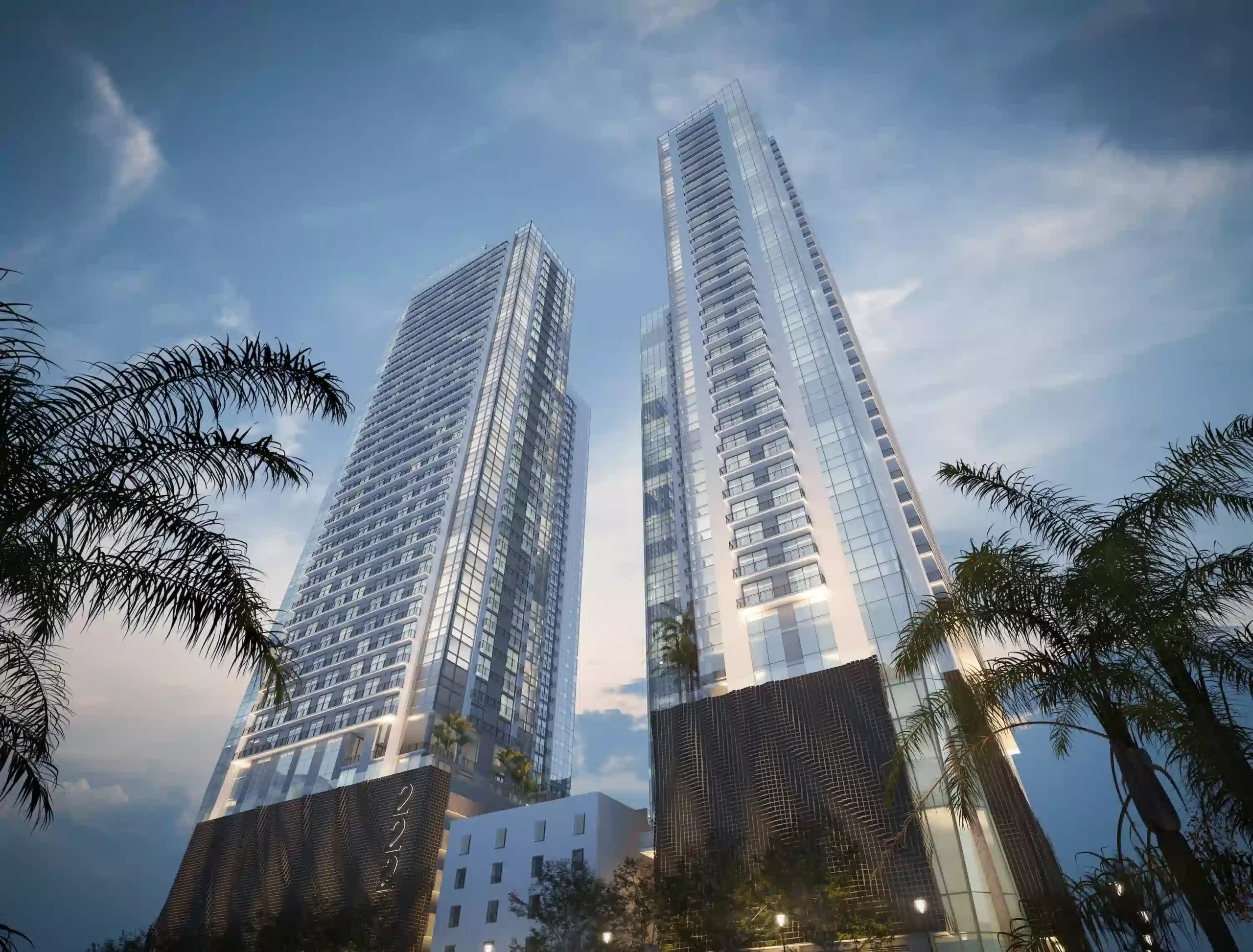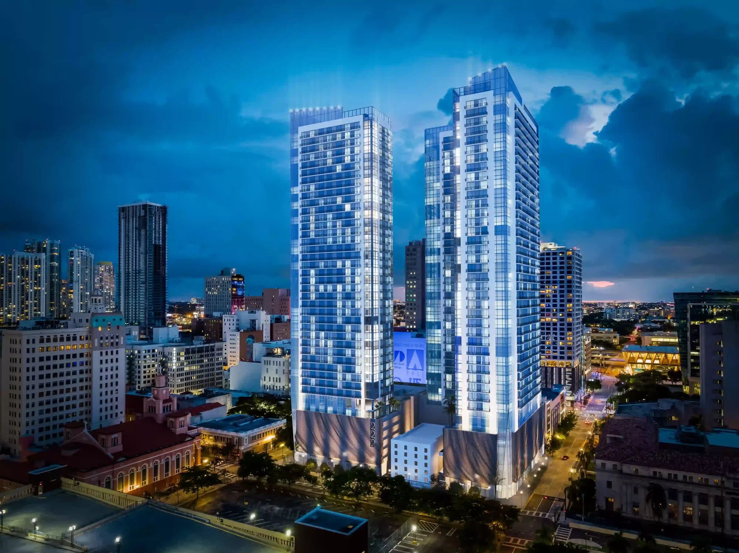 This project consists of two forty three story towers in Downtown Miami, with 1.3 million-square feet of mixed-use space. It aims to house 1,394 residential units alongside 7,984 square feet of commercial space on the ground floor. Amenities will include a pool deck, a cabana area, barbecue space, a gym and fitness studio, game lounge, coworking spaces, bowling room, and golf simulator room.