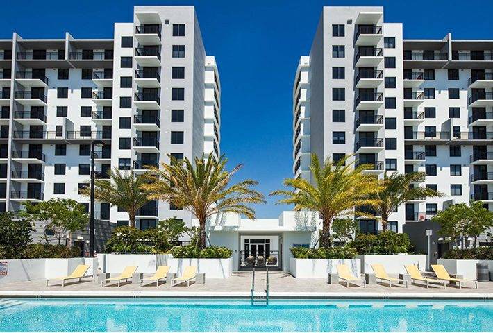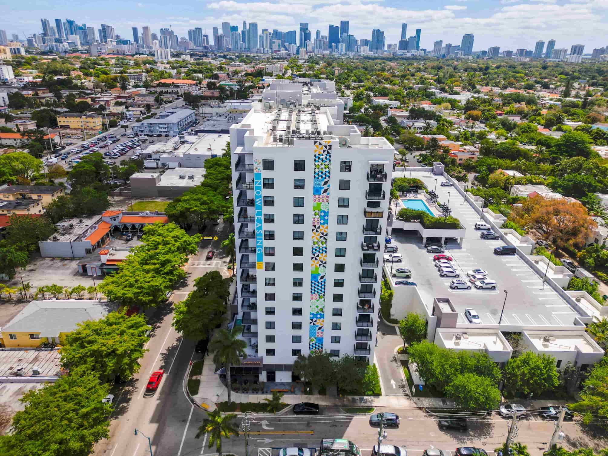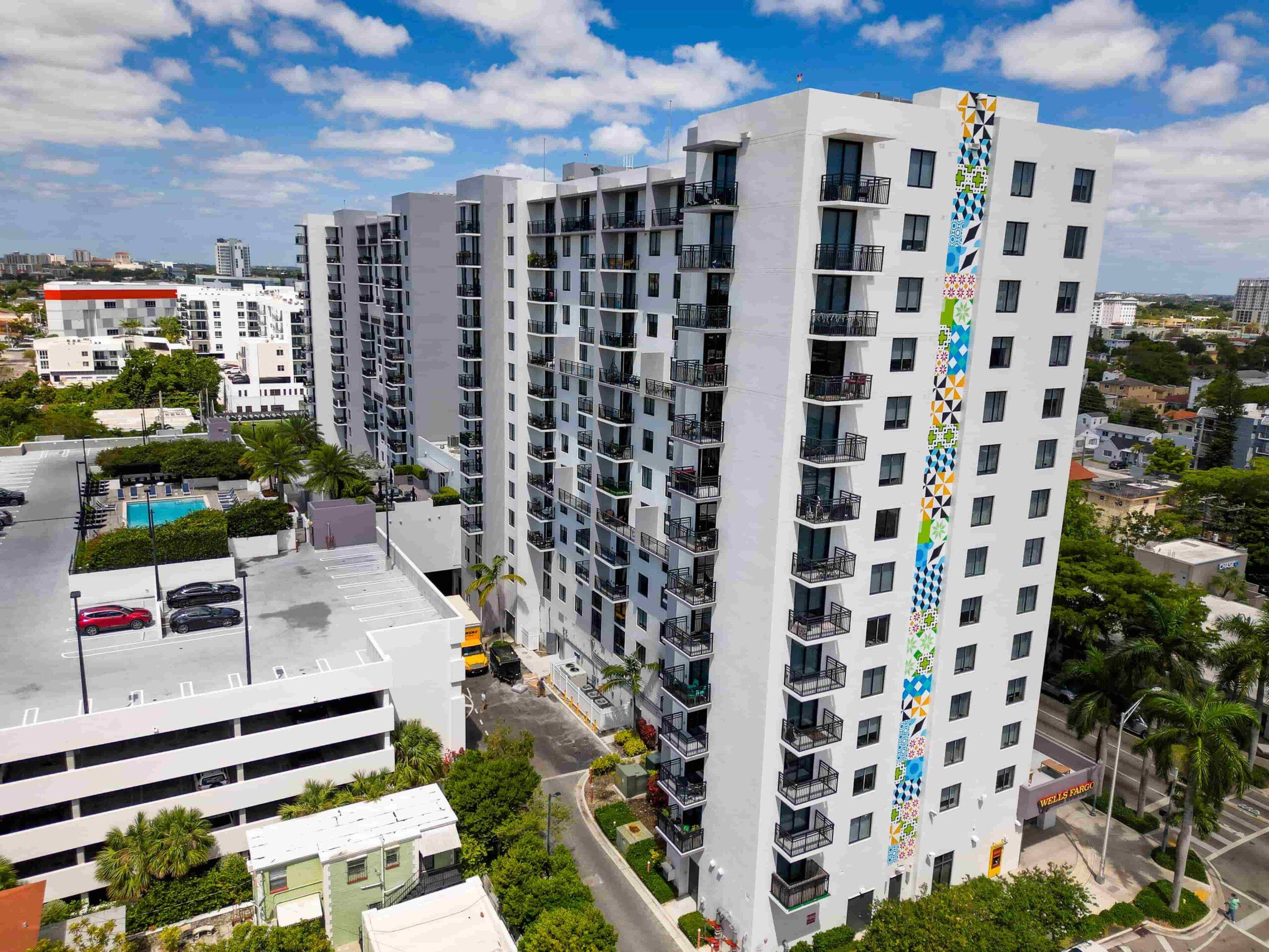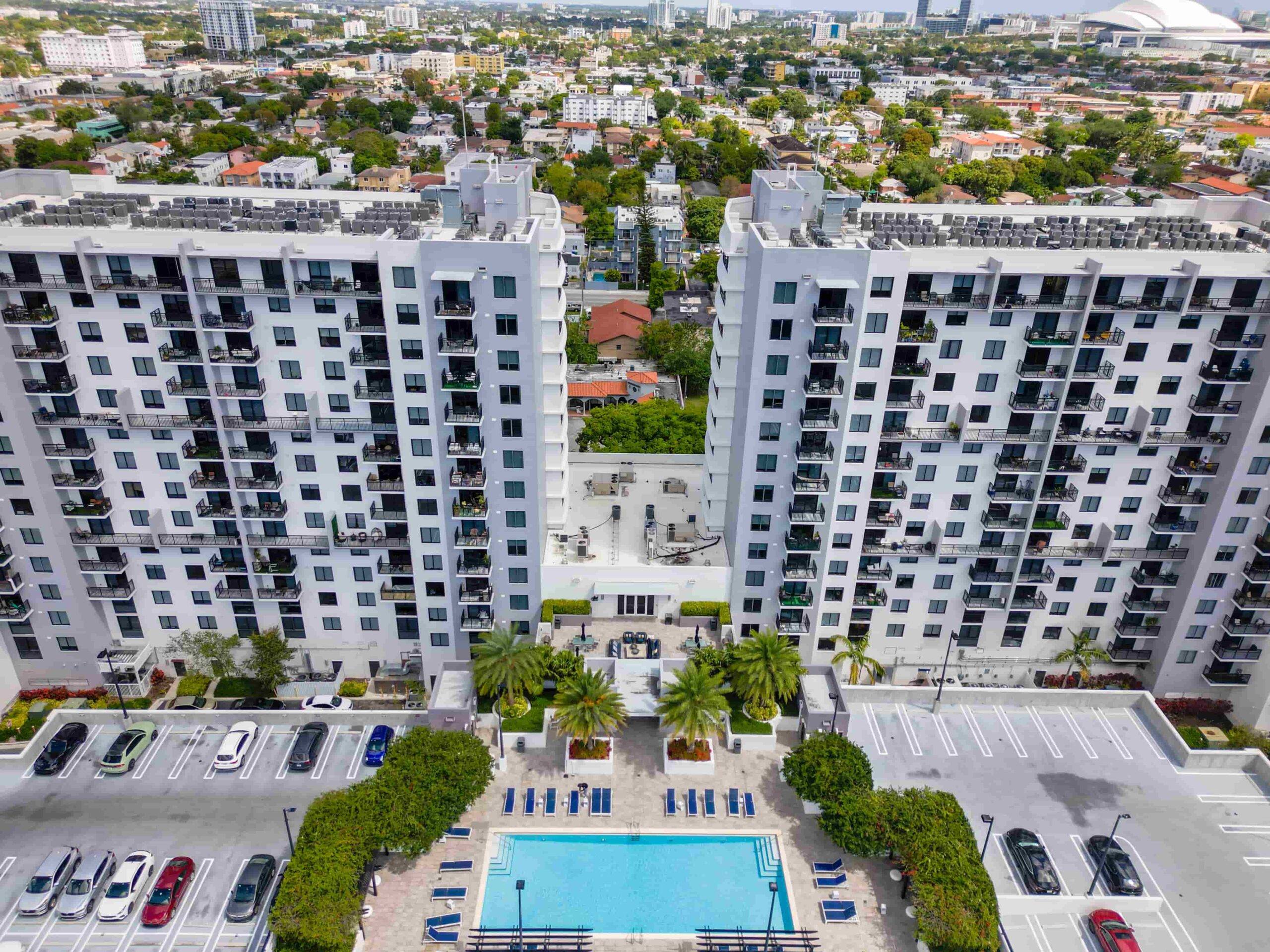 The project consists of two 14 story mixed-use buildings with a remote/detached parking Structure with an approximate total of 17,000 square feet of retail area, 320 residential units. Amenities include conference rooms, a fitness center, a pool deck, lounge space, grills, and cabanas.